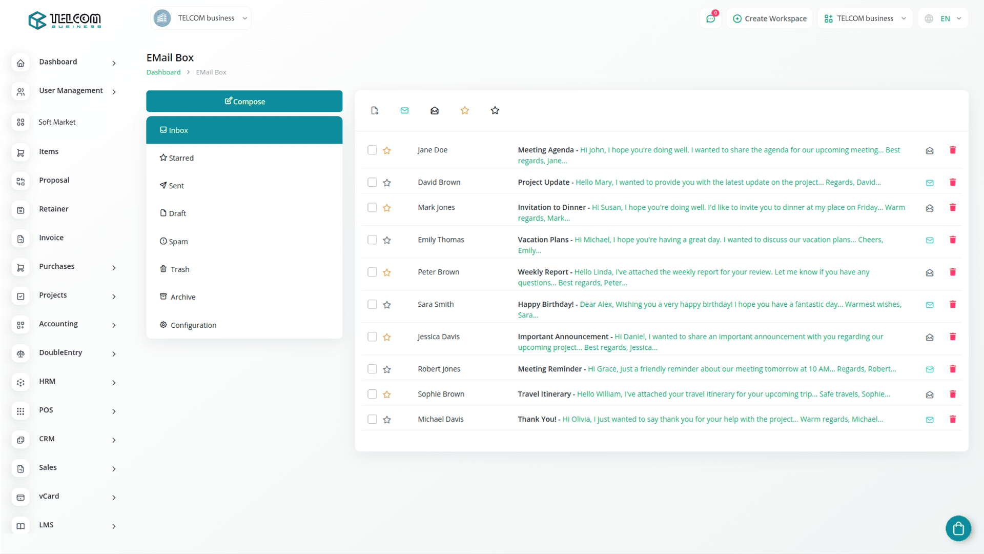 В решении EMail Box вы получаете удобный доступ ко всем своим папкам электронной почты, включая входящие, черновики, спам, отправленные, корзину и архив, которые размещены на вашем SMTP-сервере.